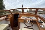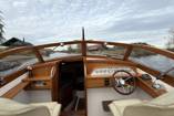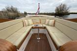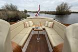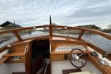 Het vakmanschap van Rapsody Yachts is tot in elk detail zichtbaar. De romp in diepblauw polyester en de raampartijen van mahonie zorgen voor een onweerstaanbare, stijlvolle uitstraling. In het voorjaar van 2025 is het mahonie aan de buitenzijde volledig kaal gehaald en met maar liefst 16 lagen lak opnieuw opgebouwd — een teken van zorg, liefde en perfectie. Het teakdek en de teakhouten salon voegen daar een warme, nautische sfeer aan toe.